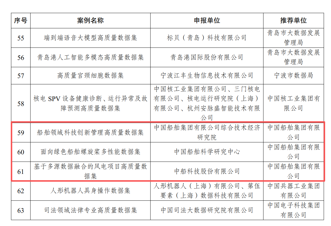 近日,国家数据局在2025中国国际大数据产业博览会上发布了首批104个高质量数据集典型案例。中国船舶集团有限公司旗下综合院申报的“船舶领域科技创新管理高质量数据集”、七〇二所申报的“面向绿色船舶的螺旋桨多性能数据集”、中船科技申报的“基于多源数据融合的风电项目高质量数据集”成功入选并发布。