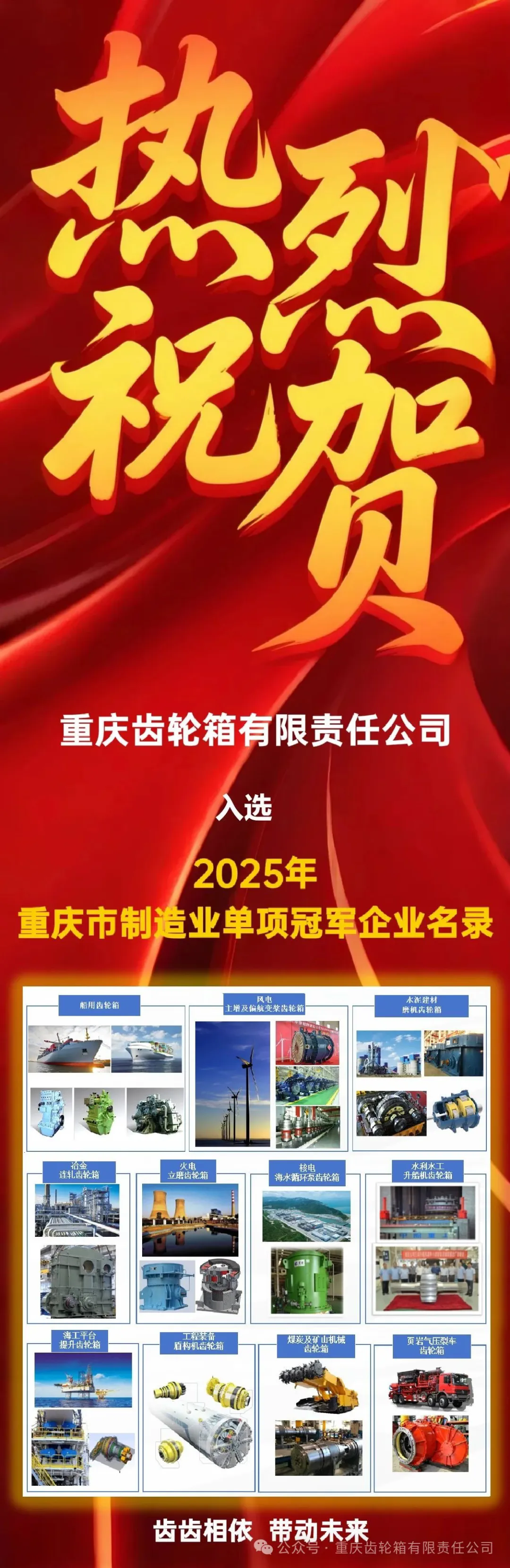 近日,重庆市经济信息委公布了2025年度重庆市制造业单项冠军企业名录,共30家企业入选,重庆齿轮箱有限责任公司作为一家有着近60年研发和制造高、低速重载齿轮箱为主的大型专业化企业,名列其中!